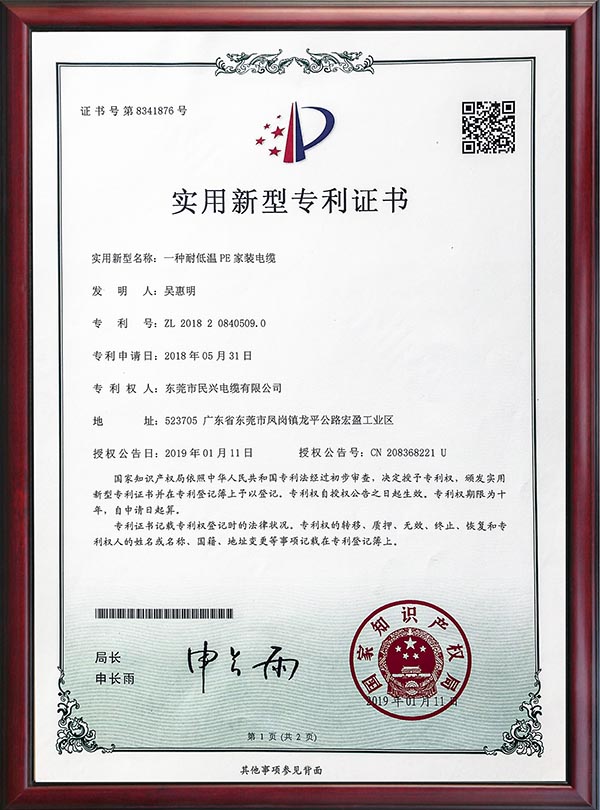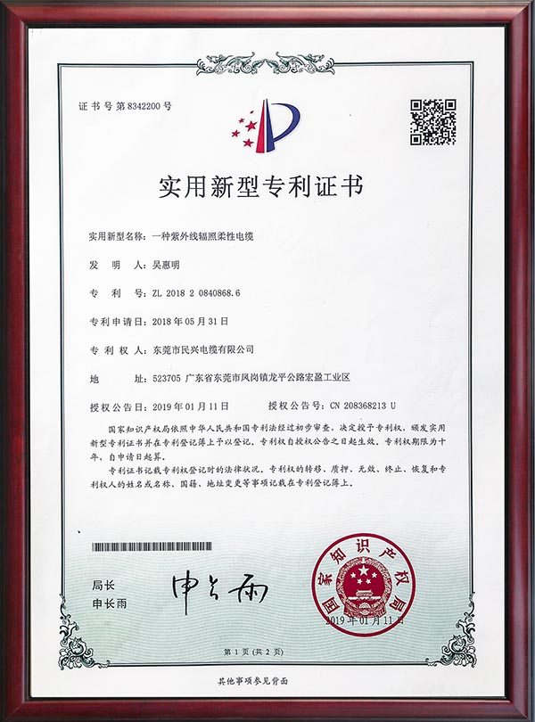 • 专利证书-一种紫外线辐照柔性电缆-2019