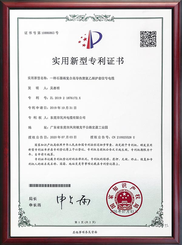 • 专利证书-一种石墨烯符合高导热聚氯乙烯护套信号电缆