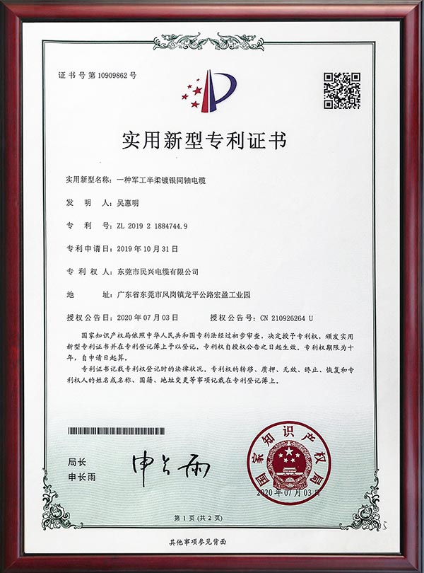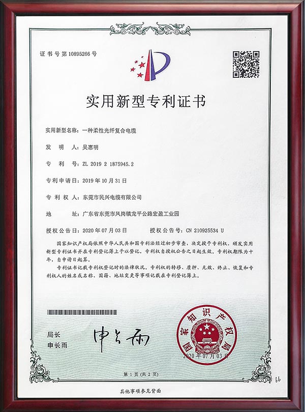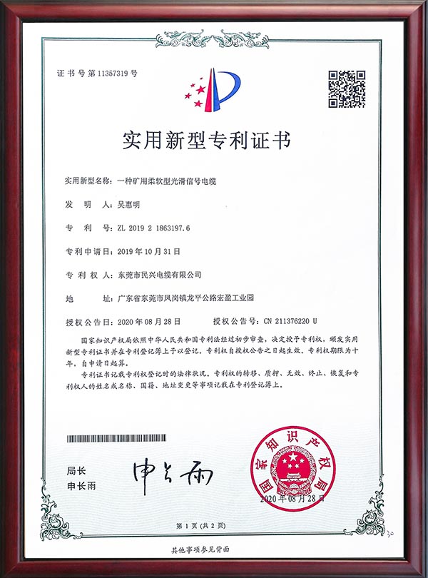 • 专利证书-一种矿用柔软型光滑信号电缆