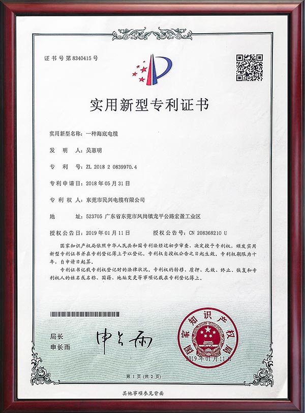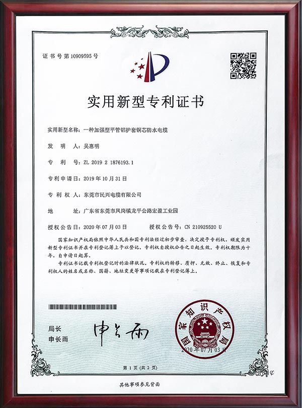 • 专利证书-一种加强型平管铝护套铜芯防水电缆