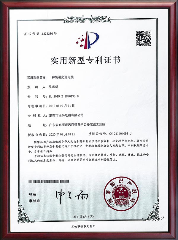 • 专利证书-一种机车合金铜轨道电缆-2019