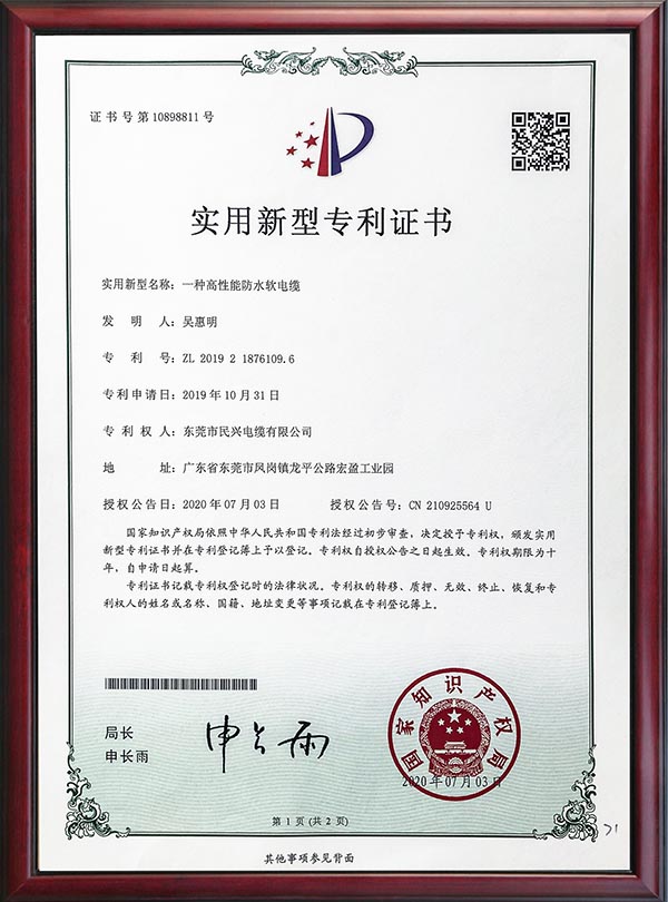 • 专利证书-一种高性能防水软电缆