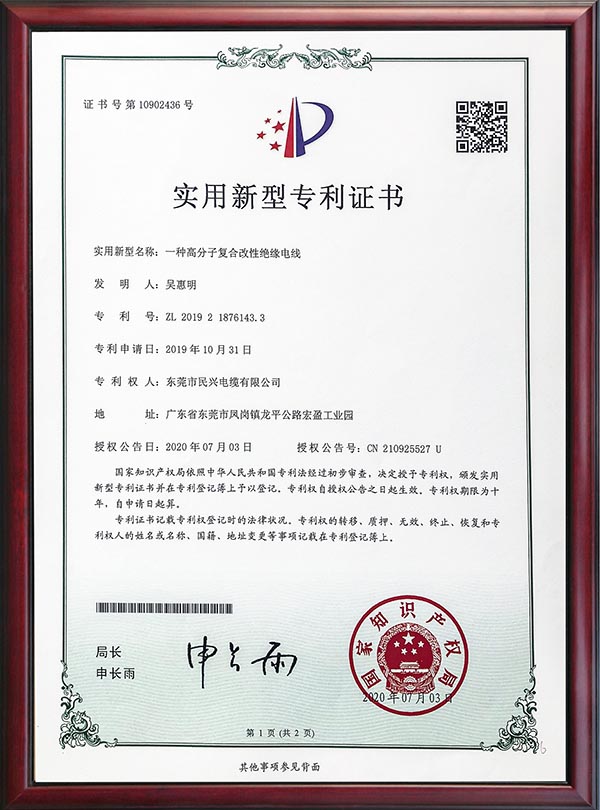 • 专利证书-一种高分子复合改性绝缘电线