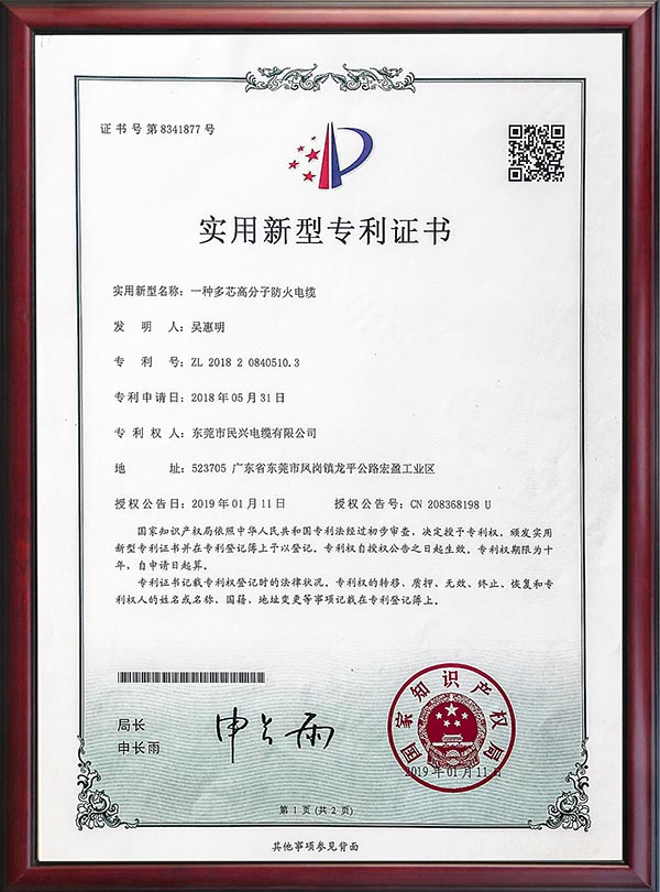 • 专利证书-一种多芯高分子防火电缆-2019
