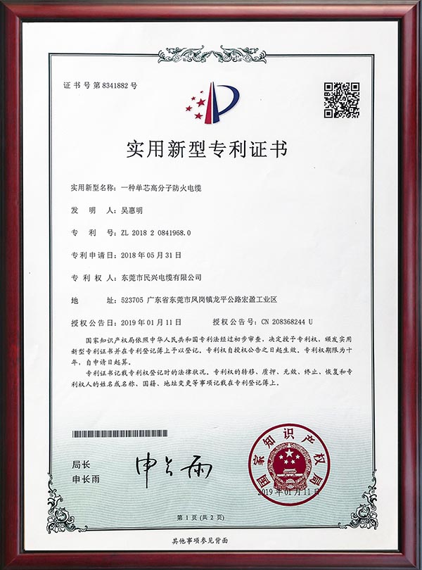 • 专利证书-一种单芯高分子防火电缆-2019