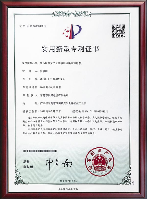 • 专利证书-高压电缆交叉互联接地连接同轴电缆