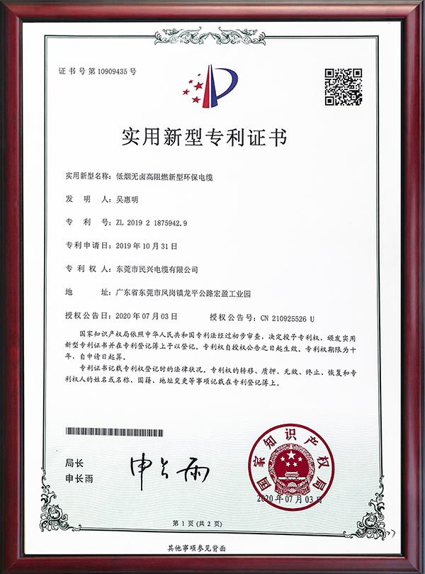 • 专利证书-低烟无卤高阻燃新型环保电缆