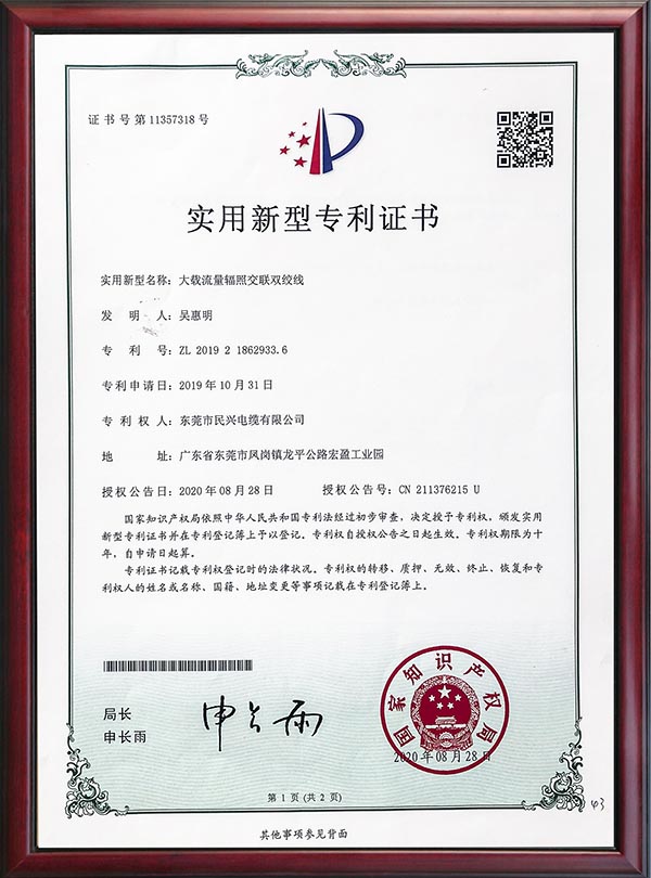 • 专利证书-大载流量辐照交联双绞线