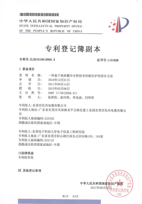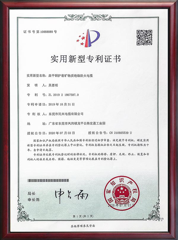 • 专利证书-扁平铜护套矿物质绝缘防火电缆