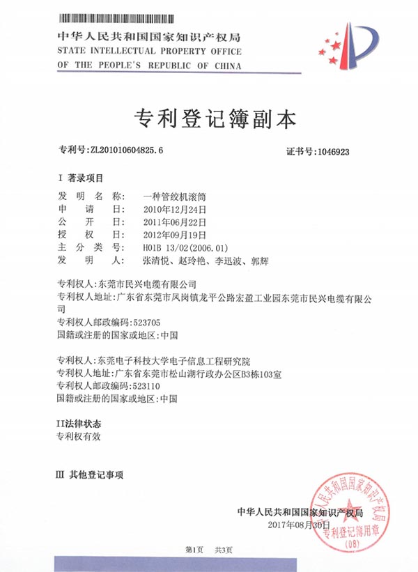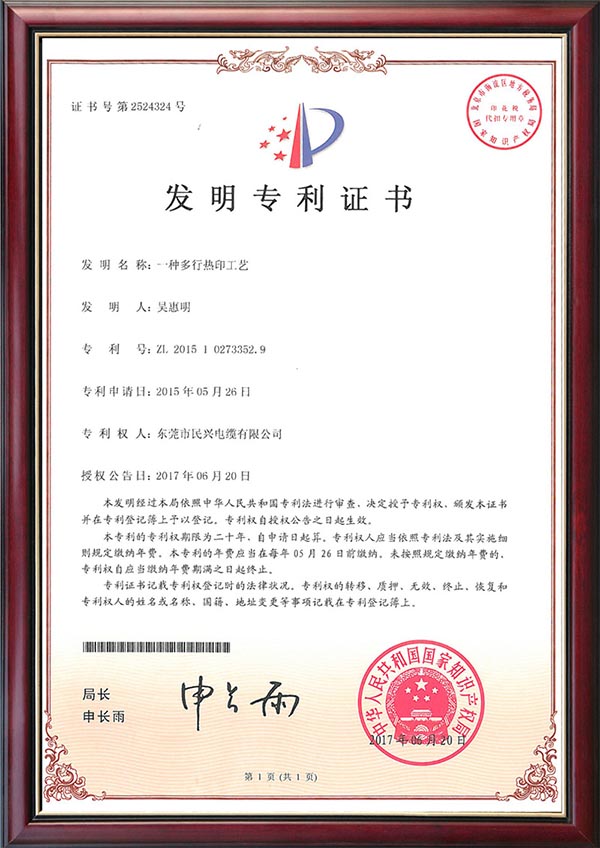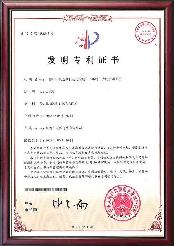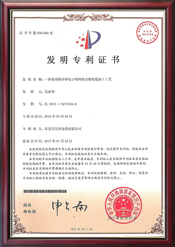 • 发明专利证书--一种采用热印和电子喷码结合的电缆加工工艺