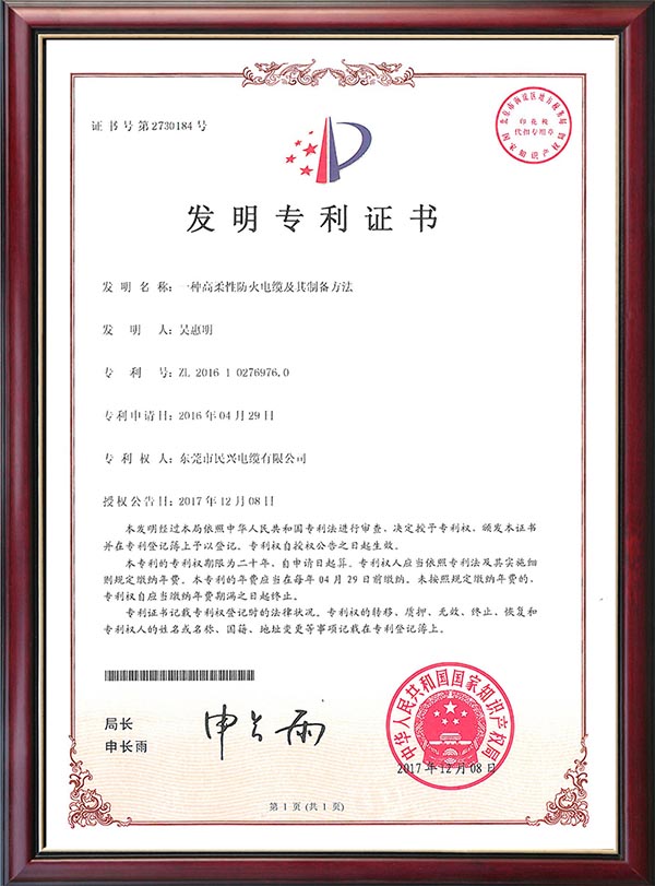 • 发明专利证书-一种高柔性防火电缆及其制备方法