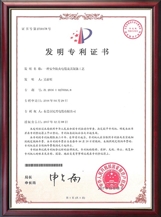 • 发明专利证书-一种安全防火电缆及其制备工艺