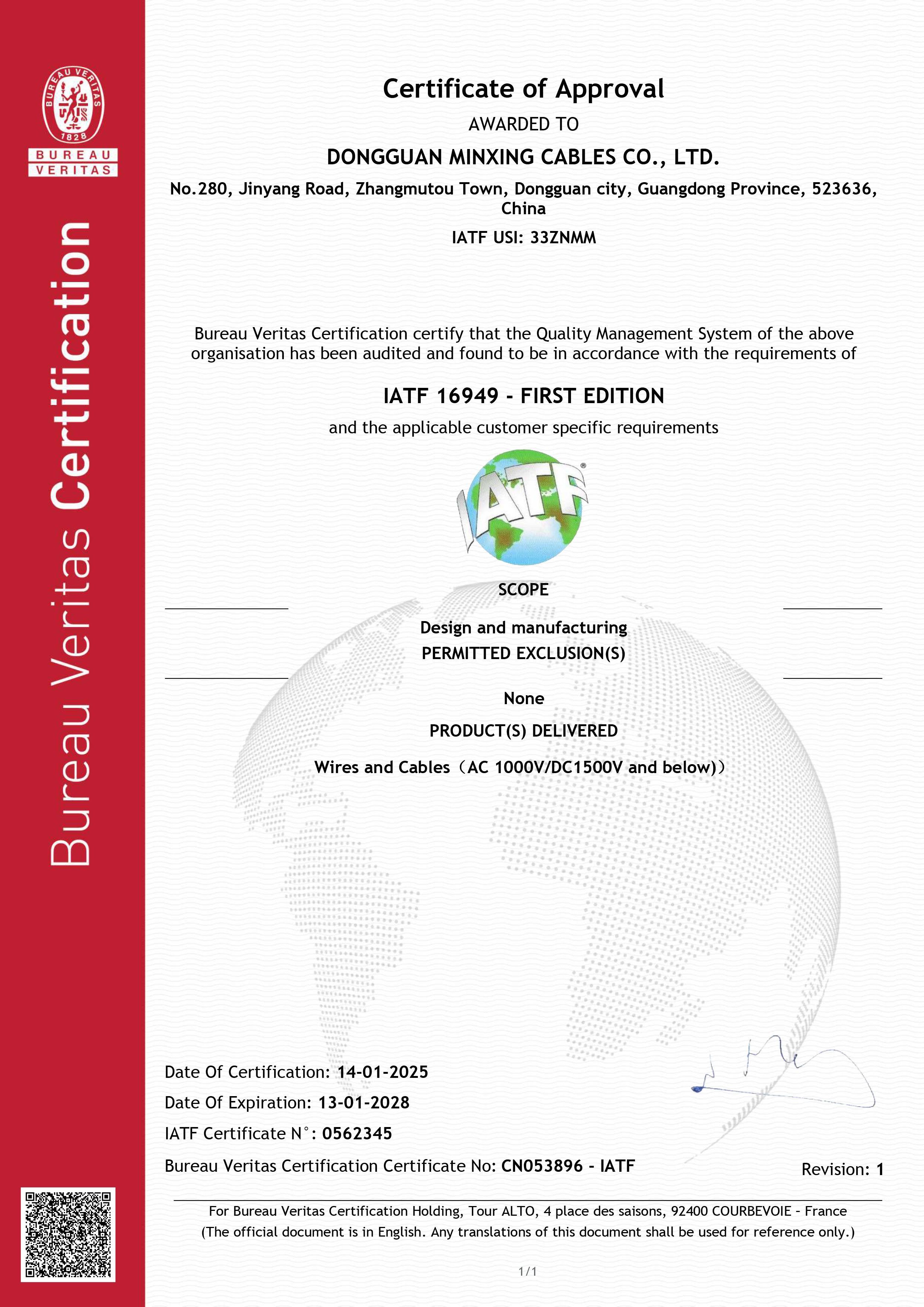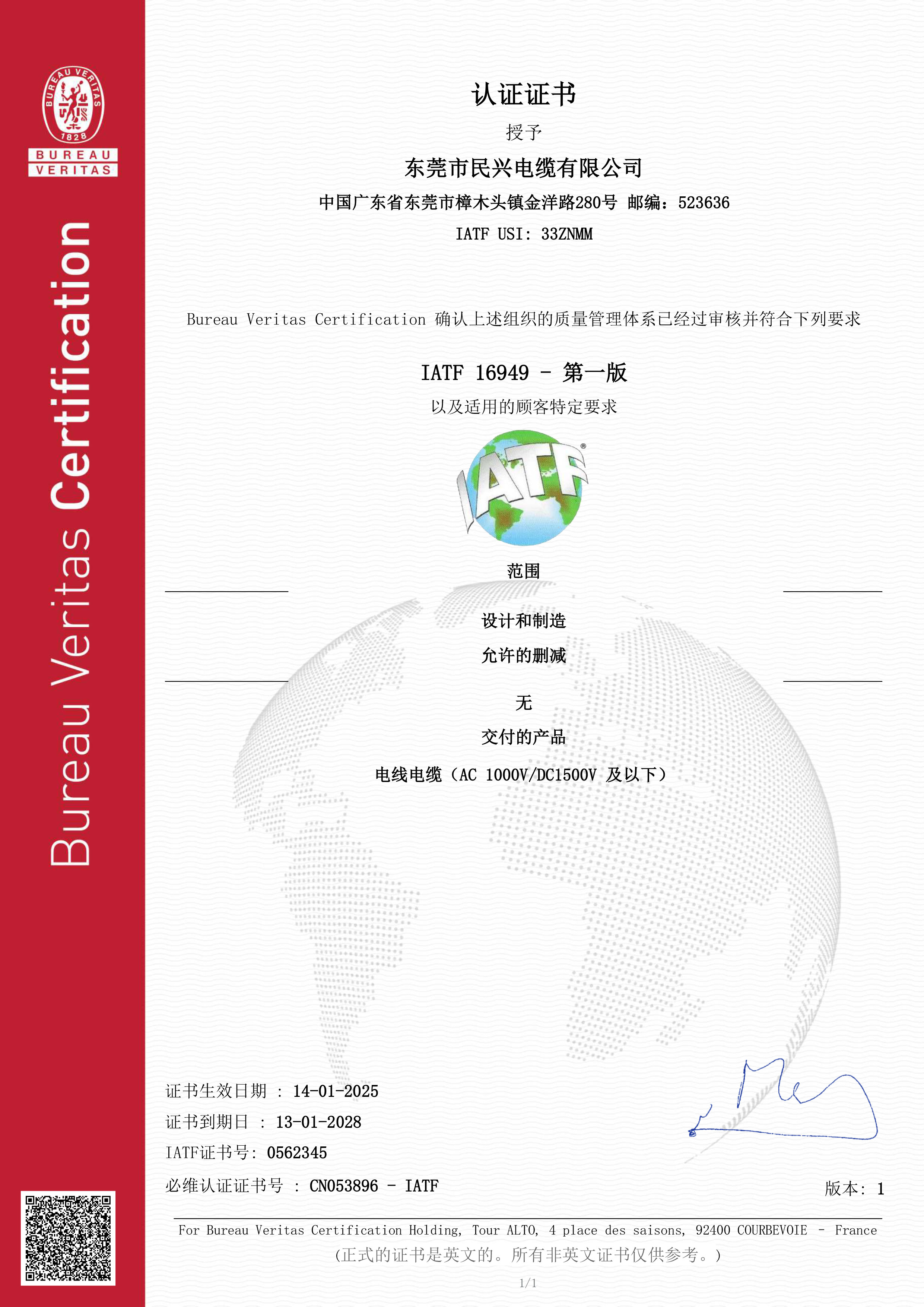 该项顺利通过IATF 16949小车业质量水平操作机制认证服务,一方面标志图案着民兴电线电缆安全性能管理制度水平方向迈好了是一个新的较高,也为企业连续转型升级快速发展流入了驱动力ඣ民兴将以IATF 16949证书为旨在,连续提高技术应用厂品开发,源源持续时间不断拓展训练厂品系列表,确保品质治理能力源源持续时间不断优化,更快地充分考虑小车餐饮服务业飞速不断成长及不断层次性化和特色化化标准,为确保各国小车餐饮服务业供货链高品质不断成长连续供献民兴实力!
